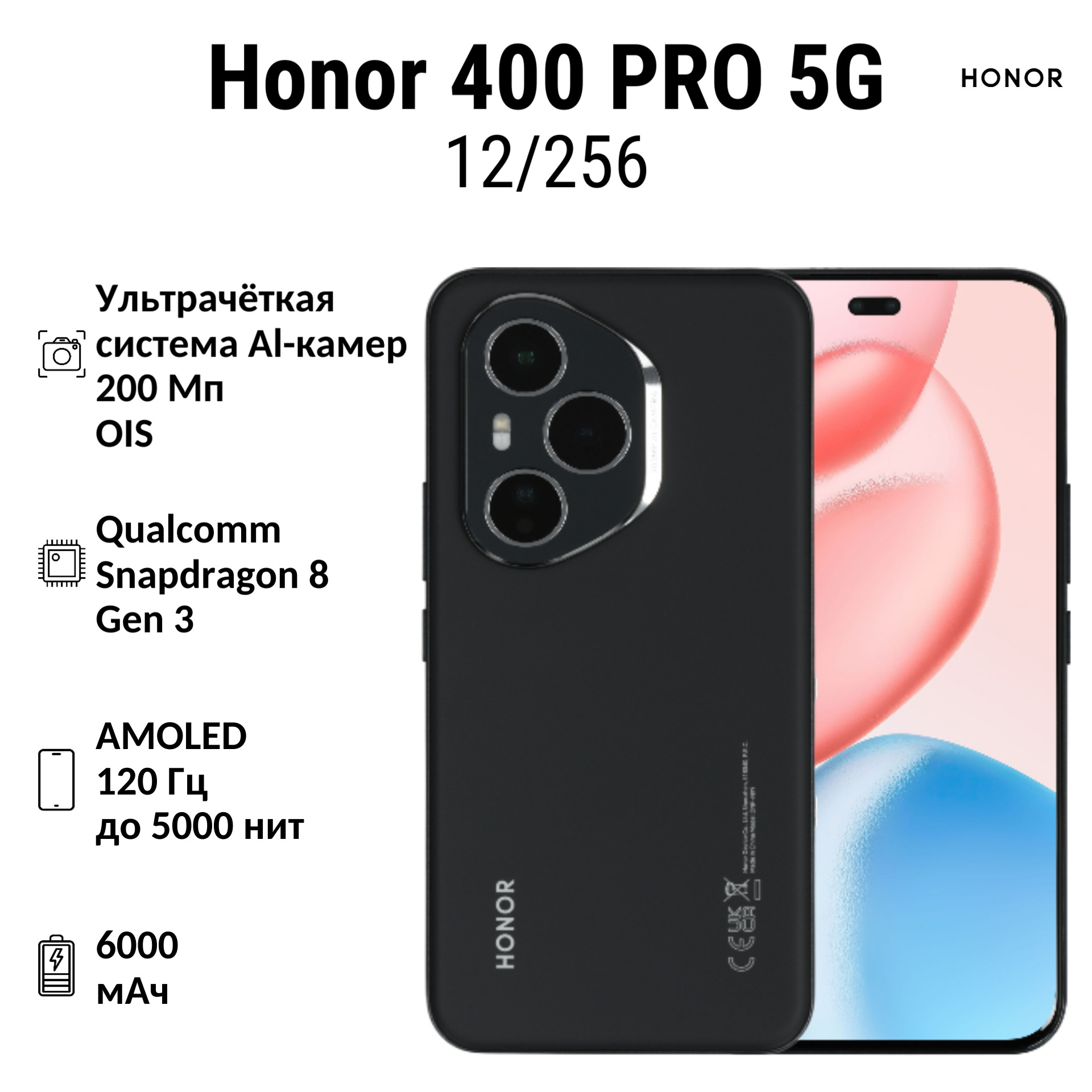 HONOR 400 Pro(Sim+eSIM) — это мощный и стильный смартфон с большим экраном и высоким разрешением. Устройство оснащено ярким и четким AMOLED дисплеем с диагональю 6.7 дюймов и разрешением 2800×1280 пикселей, который обеспечивает отличное качество изображения и комфортное использование.