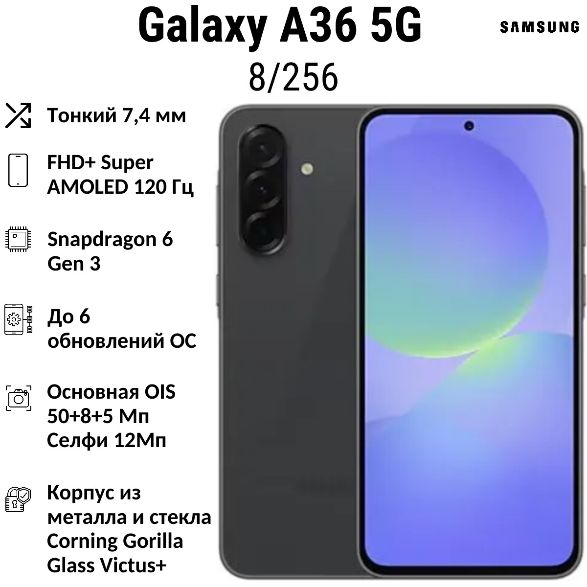 Samsung Galaxy A36 сочетает в себе стильный дизайн, прочность и надежность, что делает его идеальным выбором для повседневного использования. 6,7-дюймовый FHD+ Super AMOLED-дисплей обеспечивает высокое качество изображения, а стеклянная задняя панель и сертификация IP67 гарантируют защиту от внешних воздействий. Galaxy A36 разработан с учётом долгосрочной перспективы: устройство будет получать обновления операционной системы в течение шести поколений, а также обновления безопасности в течение шести лет.