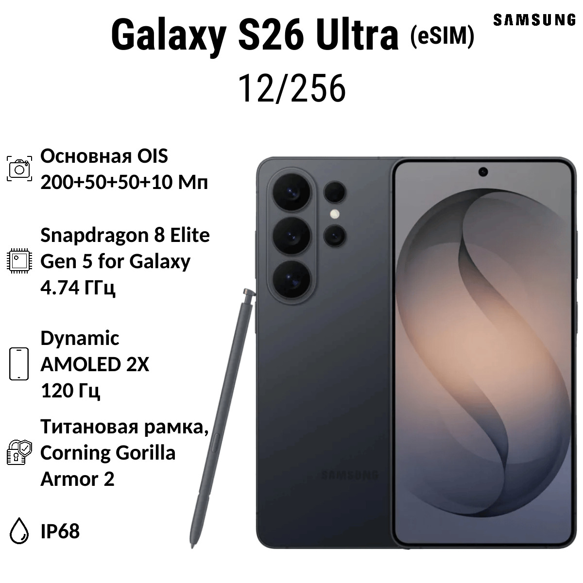 Samsung Galaxy S26 Ultra SM-S948B – мощный смартфон с 6.9″ экраном для пользователей, которым важна высокая производительность, съёмка и расширенные возможности связи. Модель подходит для работы с мультимедийным контентом, игр и профессиональной фотографии благодаря продвинутым камерам и современным технологиям.